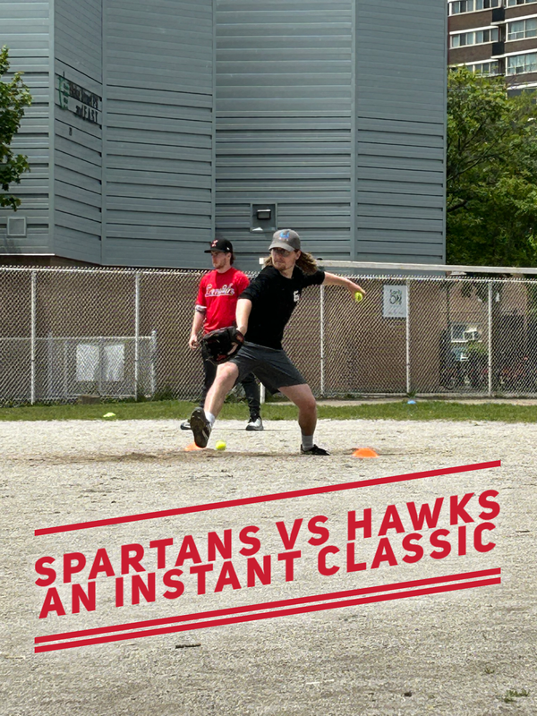 Back to nail biters for the Hawks as the Riverdale Spartans “visited” the Hood on a cool, windy Sunday afternoon. This game was truly a TBL classic and was as fine a pitching duel as we will come across in our fine league.